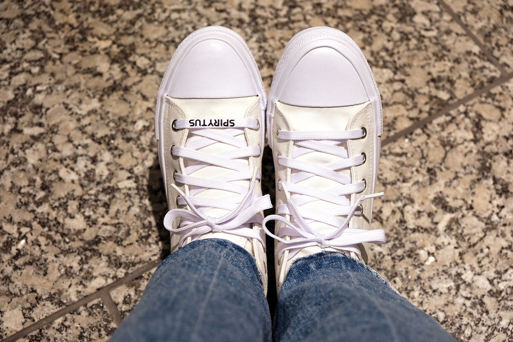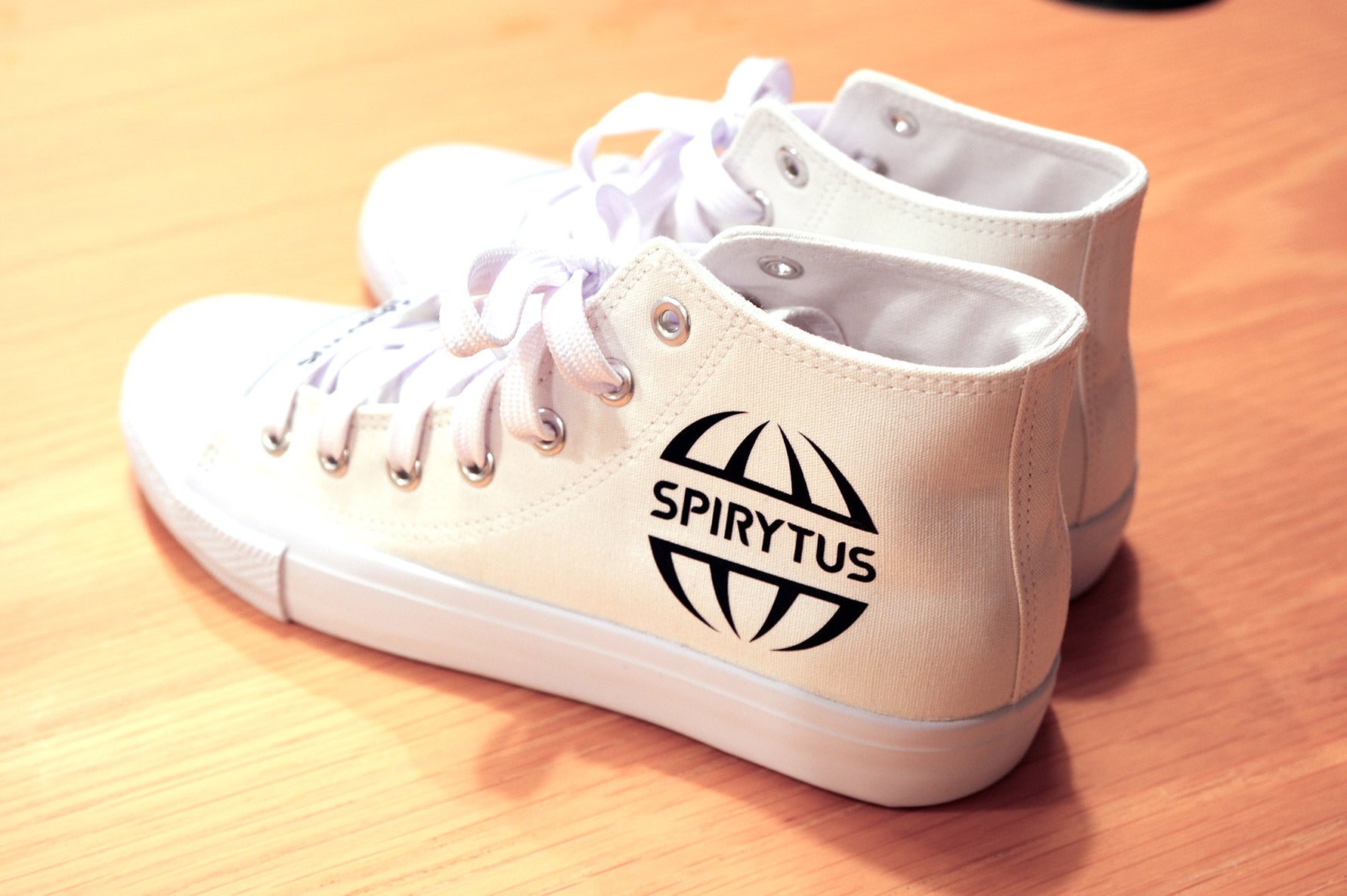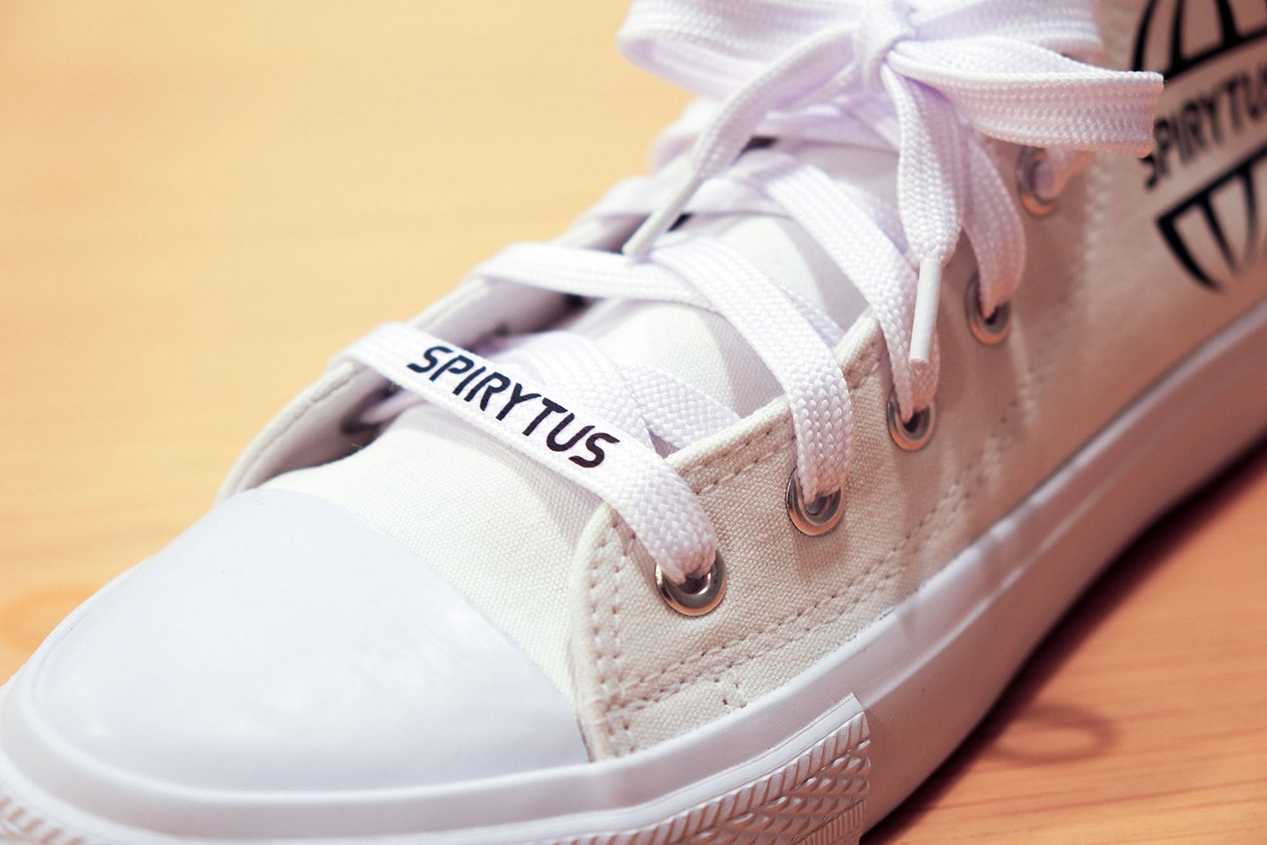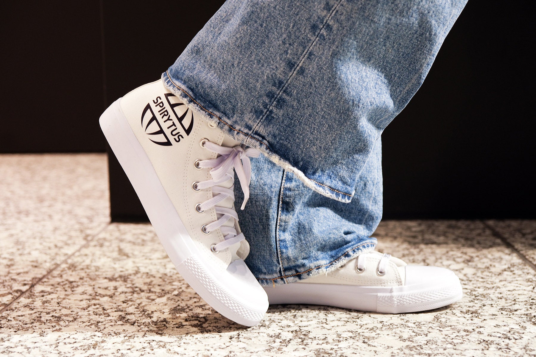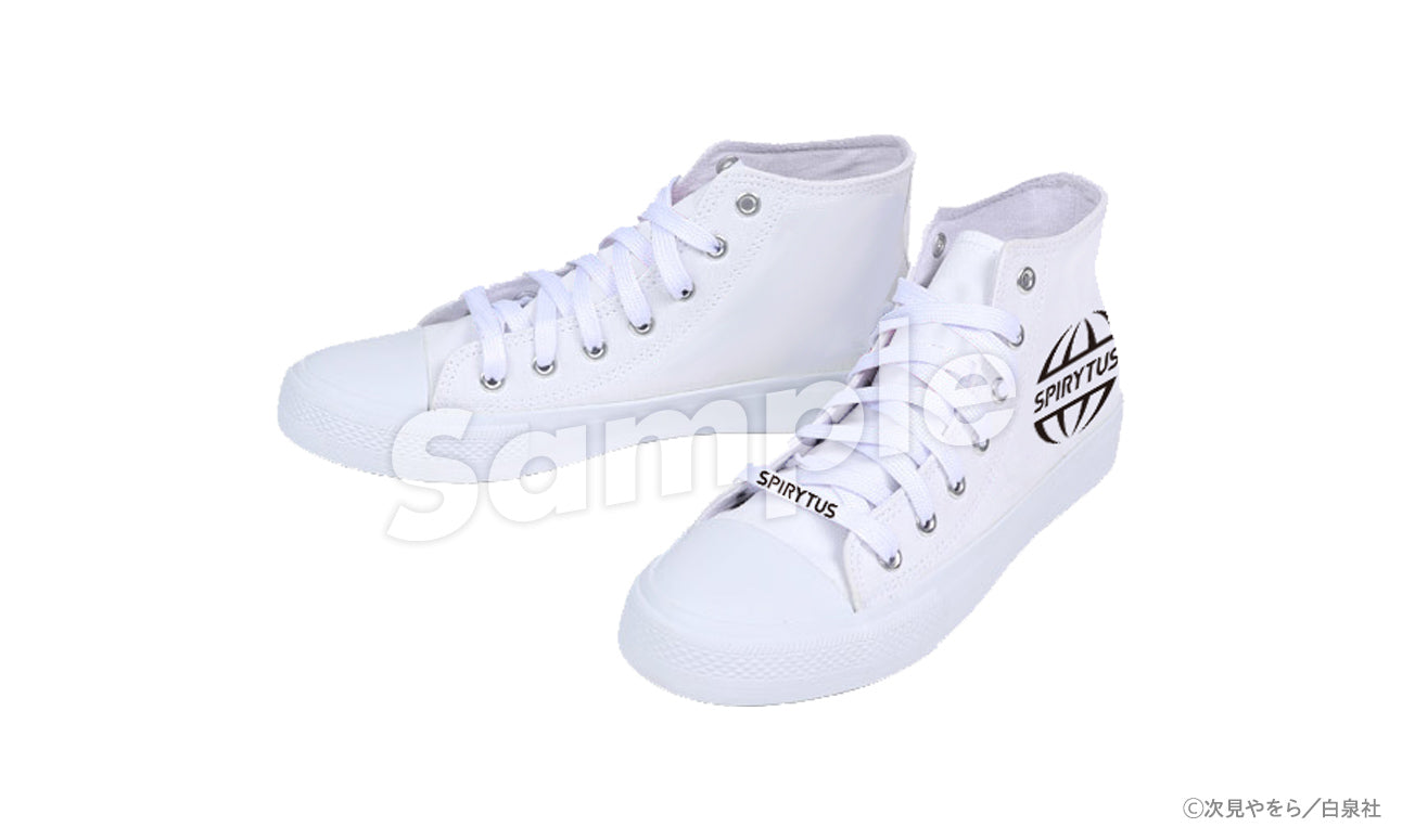 セロやシウたちがバイト中に履いていそうな、スピリタス社ロゴ入りハイカットスニーカーです。さりげないあしらいが、日常使いにぴったりです。