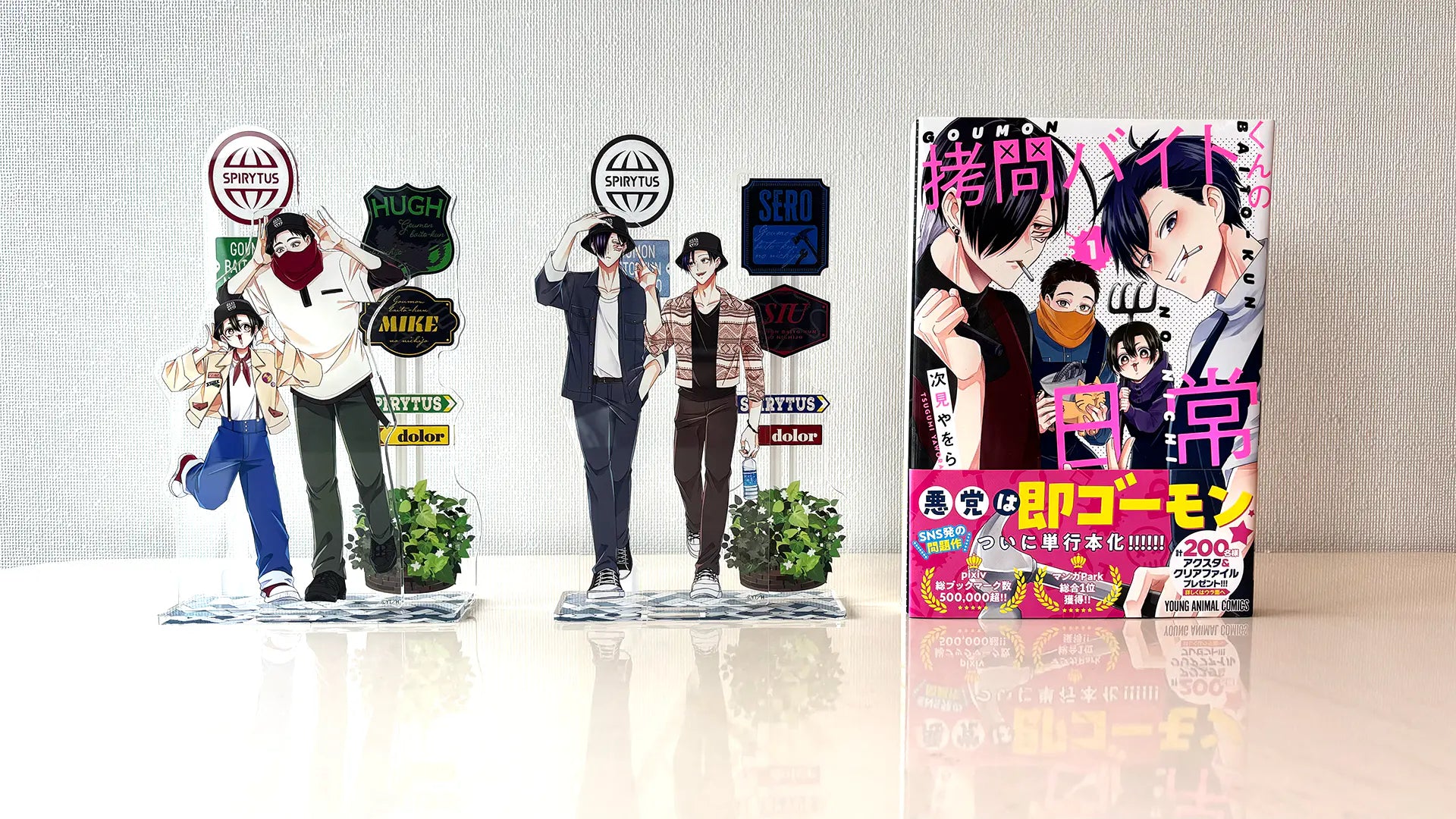本日4月24日から5月7日までの期間中にヤングアニマルWebストアにて予約注文をいただいた方に、『拷問バイトくんの日常』最新第8巻と、「スピリタス刺繍バケットハット」や、バイトくんたちがお揃いのハットを着用している描きおろしイラストを使用した「アクリルジオラマ」をセットにしてお届けします。
