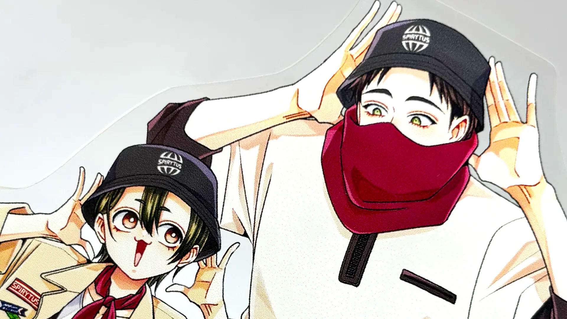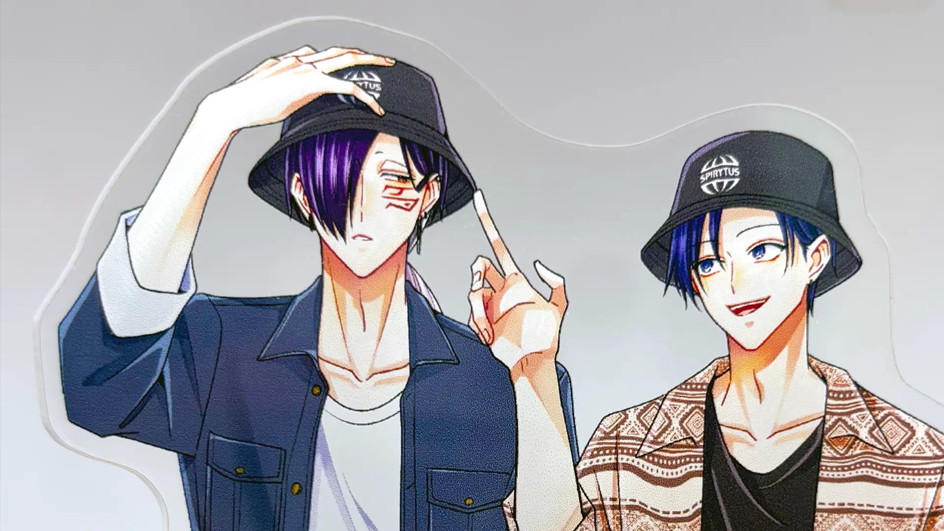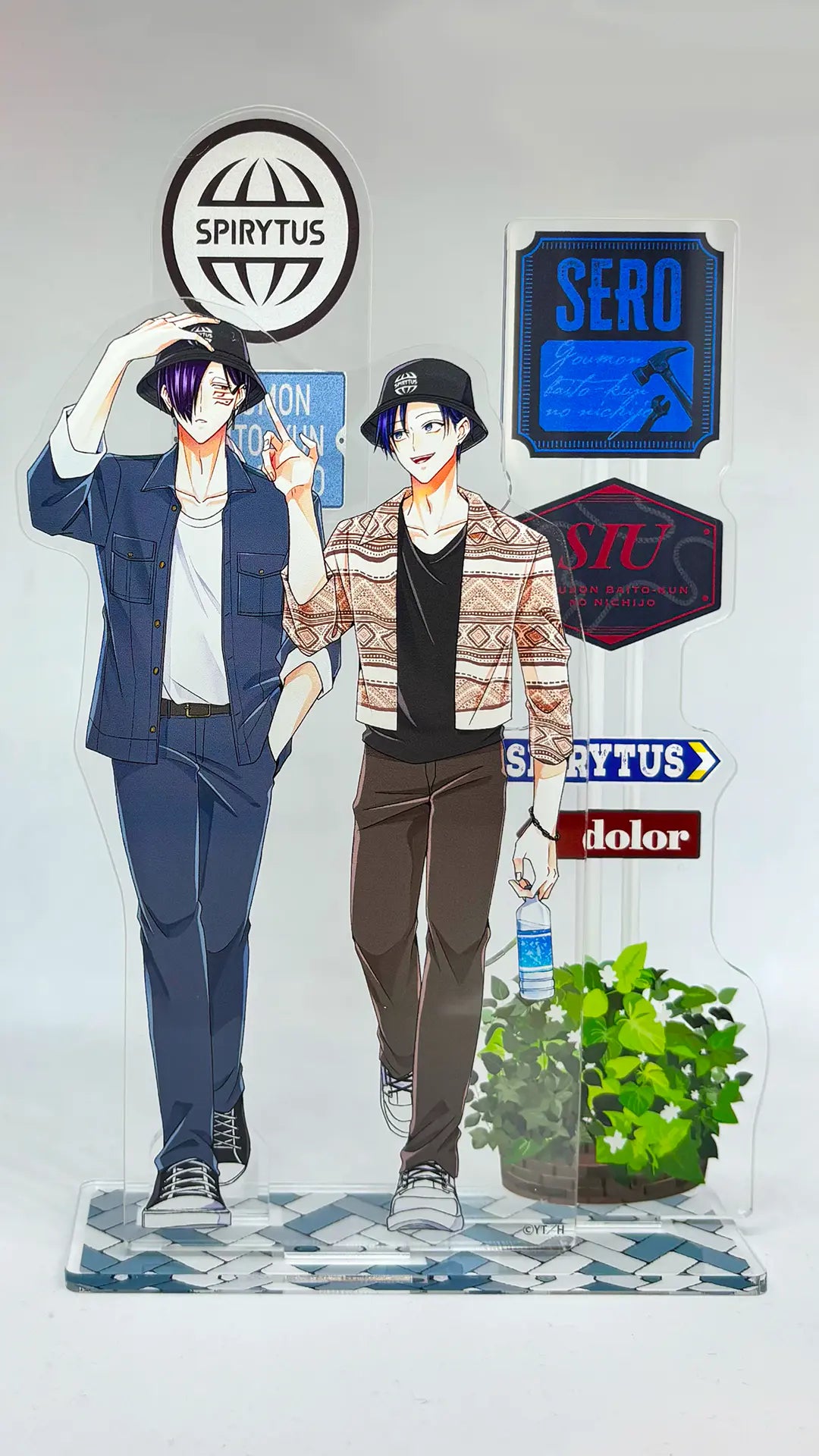 同時発売のスピリタス社バケットハットをお揃いでかぶるセロとシウを、次見やをら先生が描きおろし。描きおろしイラストを使用したジオラマ仕様のアクリルスタンドです。お揃いのハットをかぶったセロとシウが街を仲良く散歩する様子を立体的に表現しています。スピリタス社のロゴや名前が書かれた標識が付属。コミックス最新第8巻とセットでお届けします。