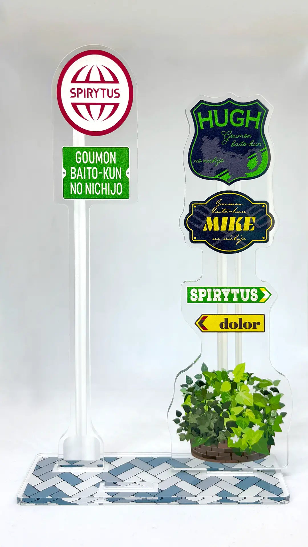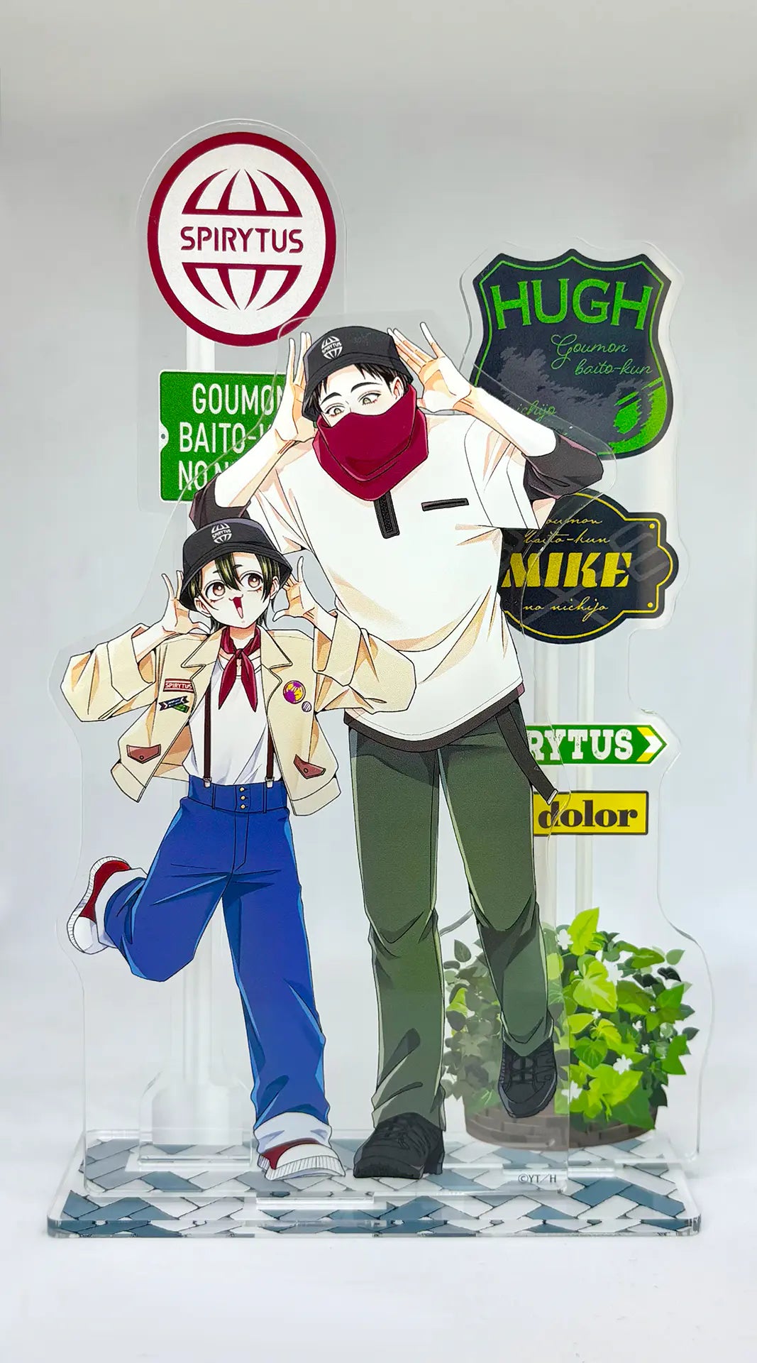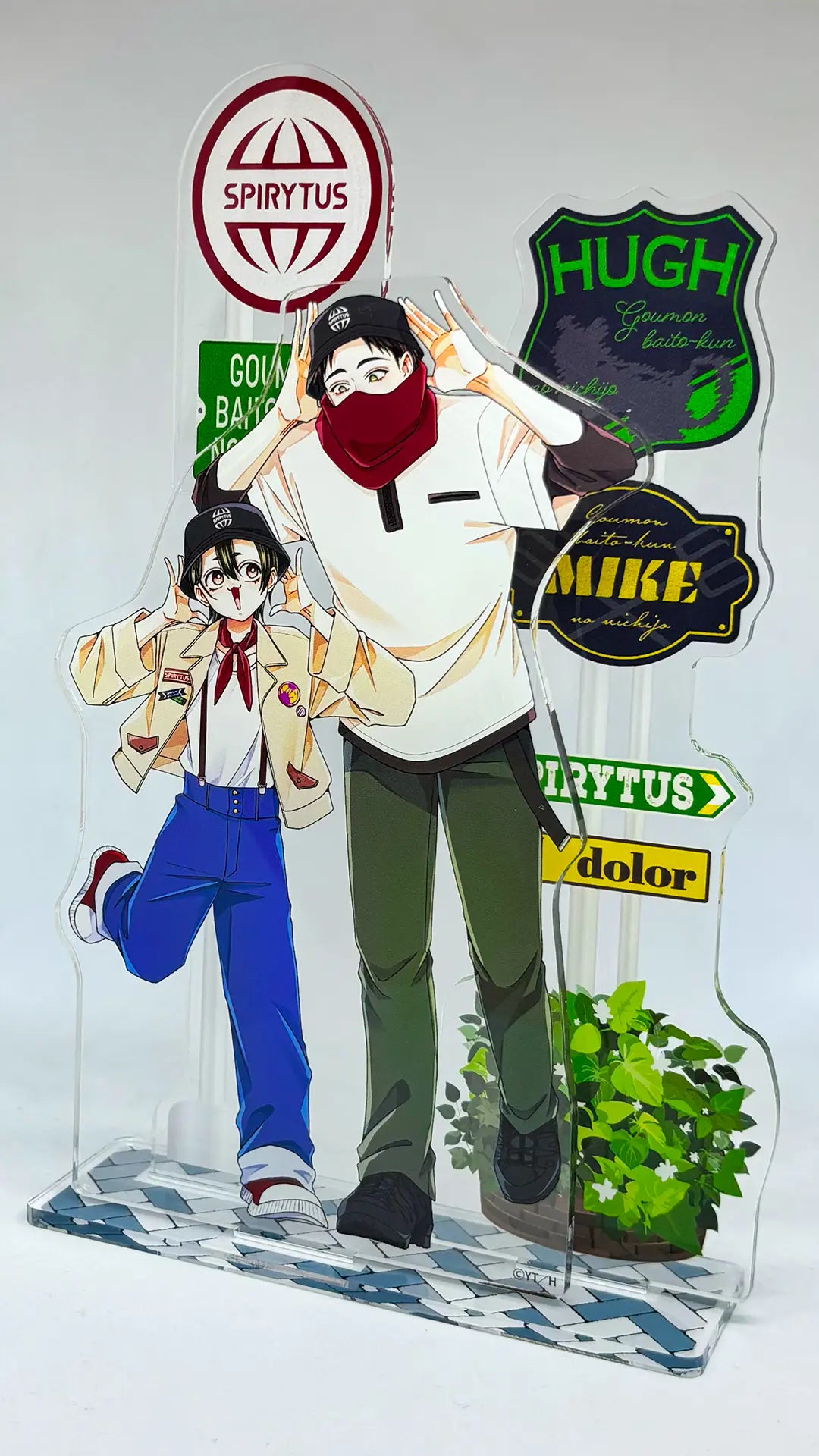 次見やをら先生描きおろしイラストを使用したミケ&ヒューver.のアクリルスタンド。お揃いでかぶっているスピリタス社バケットハットを自慢するミケとヒューが仲良く歩く様子を立体的に表現しています。スピリタス社のロゴや名前が書かれた標識が付属。コミックス最新第8巻とセットでお届けします。